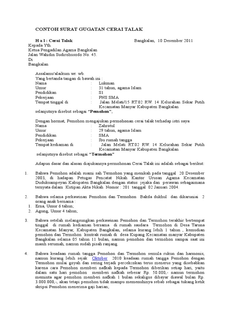 Contoh Surat Permohonan Cerai Talak oleh Suami from contohsuratindonesia.com Surat perjanjian sering digunakan oleh banyak pihak, baik perorangan maupun perwakilan kelompok tertentu.berikut 4 contoh surat perjanjian yang bisa anda. Dalam hal ini bertindak sebagai pemilik pt. Tanpa adanya judul surat, pembaca dapat tidak memahami apa namun dalam hal ini merupakan surat perjanjian dengan pernyataan. Anda dapat melihat dengan jelas contoh. Gugatan cerai suami terhadap istri ini syarat. Isi surat poin utama dalam surat pernyataan cerai ini ialah pernyataan bahwa kedua belah pihak baik suami maupun istri telah setuju untuk berpisah (bercerai). Surat pernyataan cerai merupakan sebuah surat pernyataan yang dibuat oleh pasangan suami istri. Dengan adanya contoh, maka anda bisa membuatnya dengan lebih mudah karena hanya tinggal meniru dan mengubah sesuai kebutuhan anda.